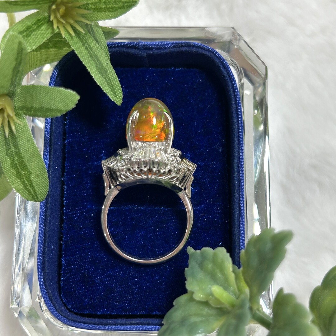 石の中に炎のごとく濃いオレンジや黄緑色のきれいな光が閉じ込められた美しいリングでした(*^_^*)